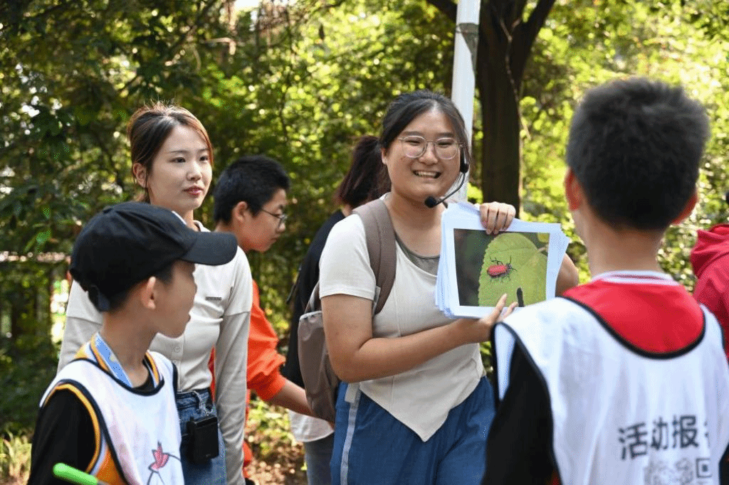在郁郁葱葱的青龙山林中绿道上,志愿者们带着青少年走走停停,孩子们好奇地观察着沿途的植物,时而翻翻草丛时而梳梳树叶,寻觅昆虫及昆虫“足迹”。一个个稀奇的小虫子或引起孩子们的尖叫或让他们心生爱怜,志愿者们生动有趣的讲解让孩子们重新认识这些“新伙伴”:天牛、步甲、草地贪夜蛾的蛹、蚜虫、甲虫的幼虫、丽金龟、红大蚁、白蚁……孩子们的好奇心驱使着应接不暇着七嘴八舌向志愿者们不断提问,一问一答之间将昆虫知识授予无声处。