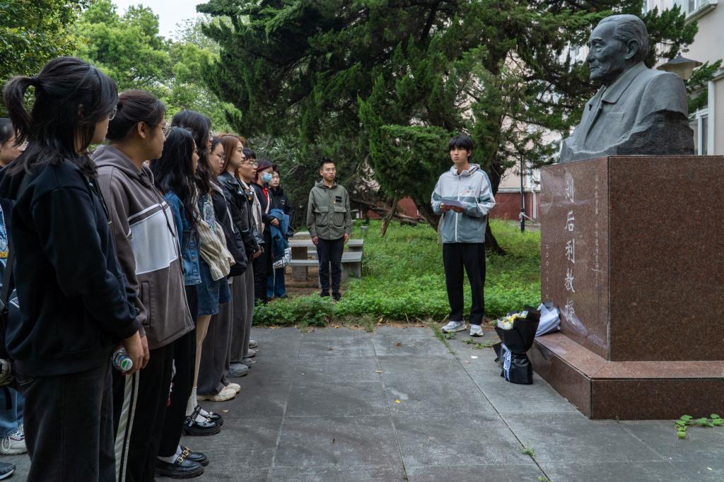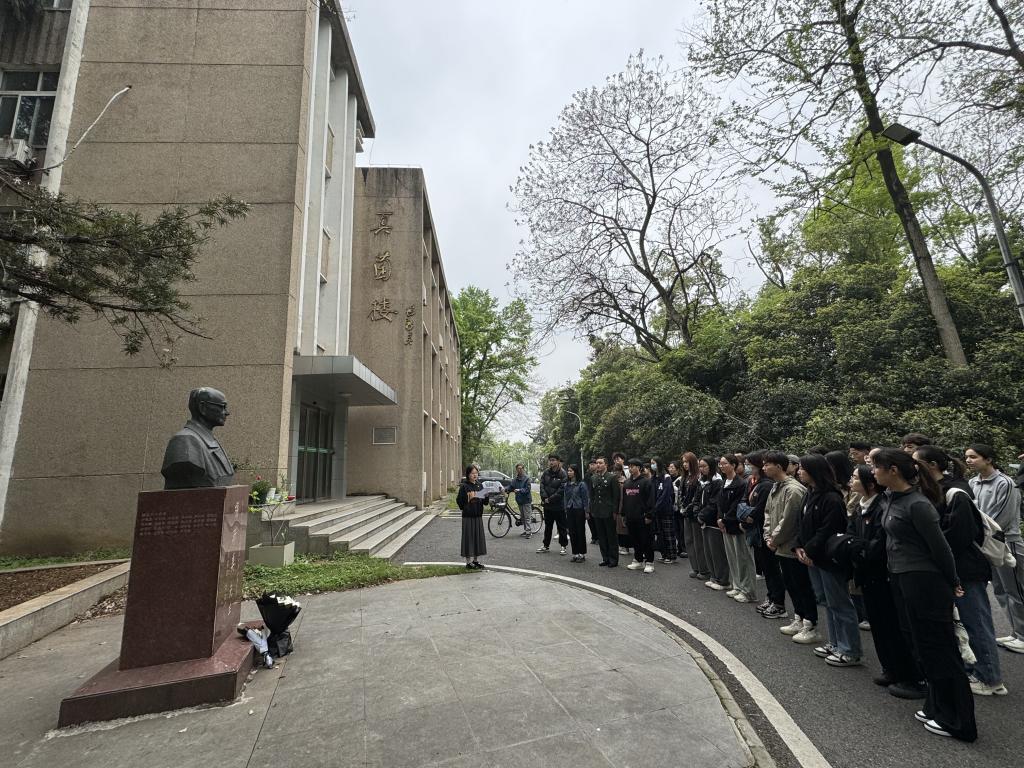 刘后利先生曾言,老师需亲身参与实验才能真正地开展科学研究,也才能真正保证工作和指导研究生的质量。段玉以此为切入,他不禁感慨道:“刘后利先生爱岗敬业、甘于奉献,我们应该以此精神为标杆,努力在平凡的岗位上踏实做好每一件事,书写不平凡的人生。” 在杨新美先生铜像前,周思维分享了先生的生平故事,她谈到:“杨新美先生一生淡泊名利,将个人的规划与国家的需求紧紧联系在一起。先生重视应用理论研究,将产业和学术研究紧密联系,他不仅是一位杰出的科学家、伟大的教育家,更是一位优秀的中国共产党员!”