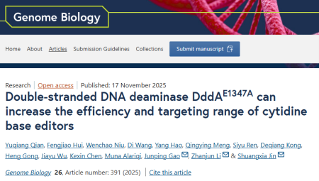 金双侠教授课题组和吉林大学李占军教授课题组联合在国际知名学术期刊《Genome Biology》在线发表题为“Double-stranded DNA deaminase DddAE1347A can increase the efficiency and targeting range of cytidine base editors”的研究论文,通过融合双链DNA脱氨酶DddAᴱ¹³⁴⁷ᴬ,成功开发出新型高效胞嘧啶碱基编辑器DMCBEs,显著提升了编辑效率与靶向范围,为动植物育种提供了全新工具。