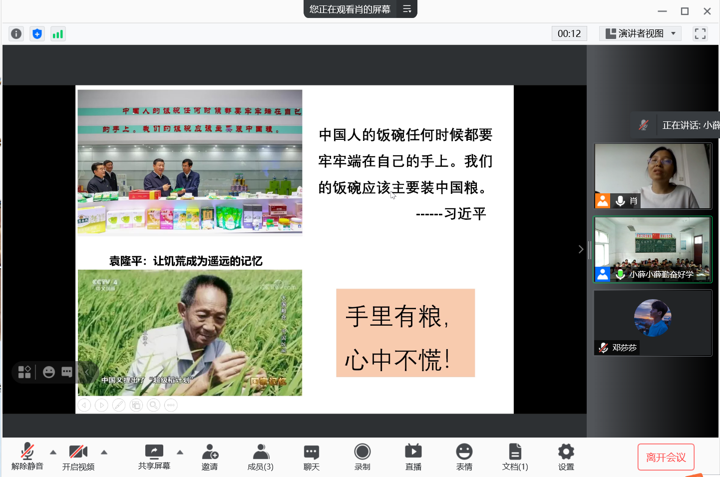 肖雪琼在线为同学们讲解粮食的重要性