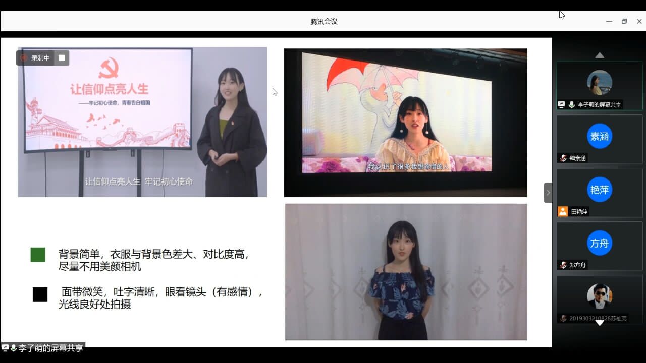 本次比赛是由视频录制,线上参赛的形式举行,李子萌分享了自己拍摄视频的经验与建议。李子萌分享到在演讲过程中最重要的是保持积极的心态和自信大方的微笑,同时,注重演讲时的仪态与气质。