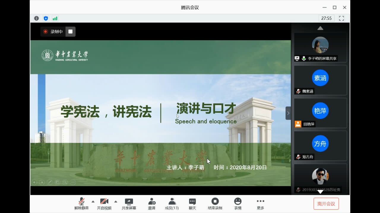 8月20日上午,植科院“学宪法,讲宪法”培训会在腾讯会议线上举办。为提升同学们写稿与演讲能力,农学1702班李子萌受邀为植科院同学开展线上备赛培训会,辅导员张涛参加本次会议。