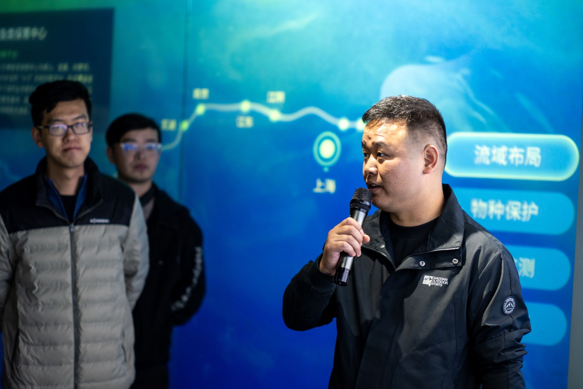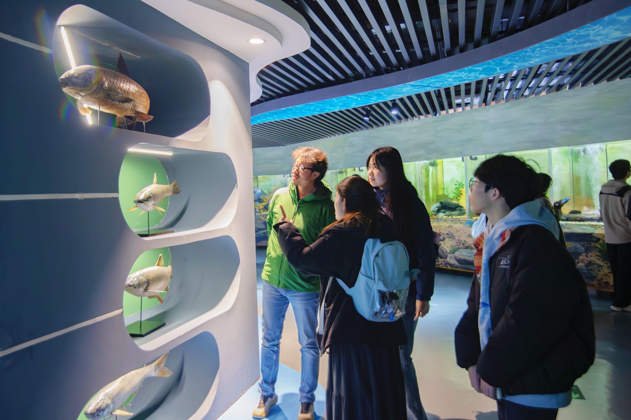中华鲟研究所专注长江珍稀鱼类保护四十余年。在李洋的引导下,师生参观长江生物多样性研究中心,通过图文展板、动态影像和实物标本,系统了解中华鲟古今演化的历史脉络、独特的洄游习性和当前面临的生存挑战。